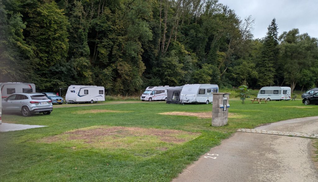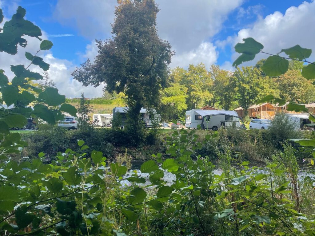 Bis auf die L-Plätze (oben von der gegenüberliegenden Flussseite aus fotografiert) geht es am Fluss entlang eher knapp zu, vor allem, wenn man sein Zugfahrzeug noch unterbringen möchte. Deshalb stellt man sich mit Markise oder Vorzelt Richtung Wasser und gewinnt dadurch etwas Raumgefühl. Die – nicht am Wasser liegenden – Wohnmobilplätze wirken großzügiger.